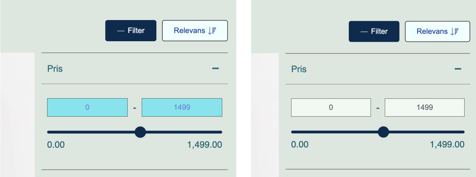 Many developers might prefer using familiar CSS/SCSS for the majority of their styling, and use our custom variables interface as little as possible. This is totally valid! Every component of the PLP has class names that you can target for custom styling. We recommend starting your selector with an id to ensure your styling has higher precedence than ours. The below example targets the input fields of the price range filter. It corrects some bad-looking colors that the inference system came up with.SCSS